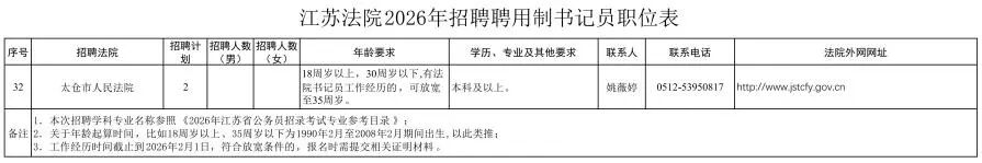 根据工作需要,太仓市人民法院面向社会公开招聘聘用制书记员2名。现将有关事项公告如下: