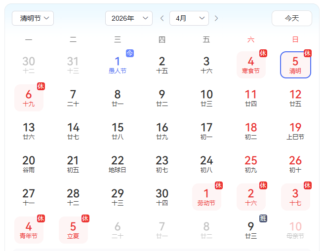 2026清明节放假安排如下:4月4日(周六)至4月6日(周一)放假,共3天,不调休。阳光太仓人才网网站相关业务及问题依然可以给我们发送站内信及网站客服QQ微信1987127758咨询,如有特殊问题请电话咨询0512-33002112、0512-33003311 。